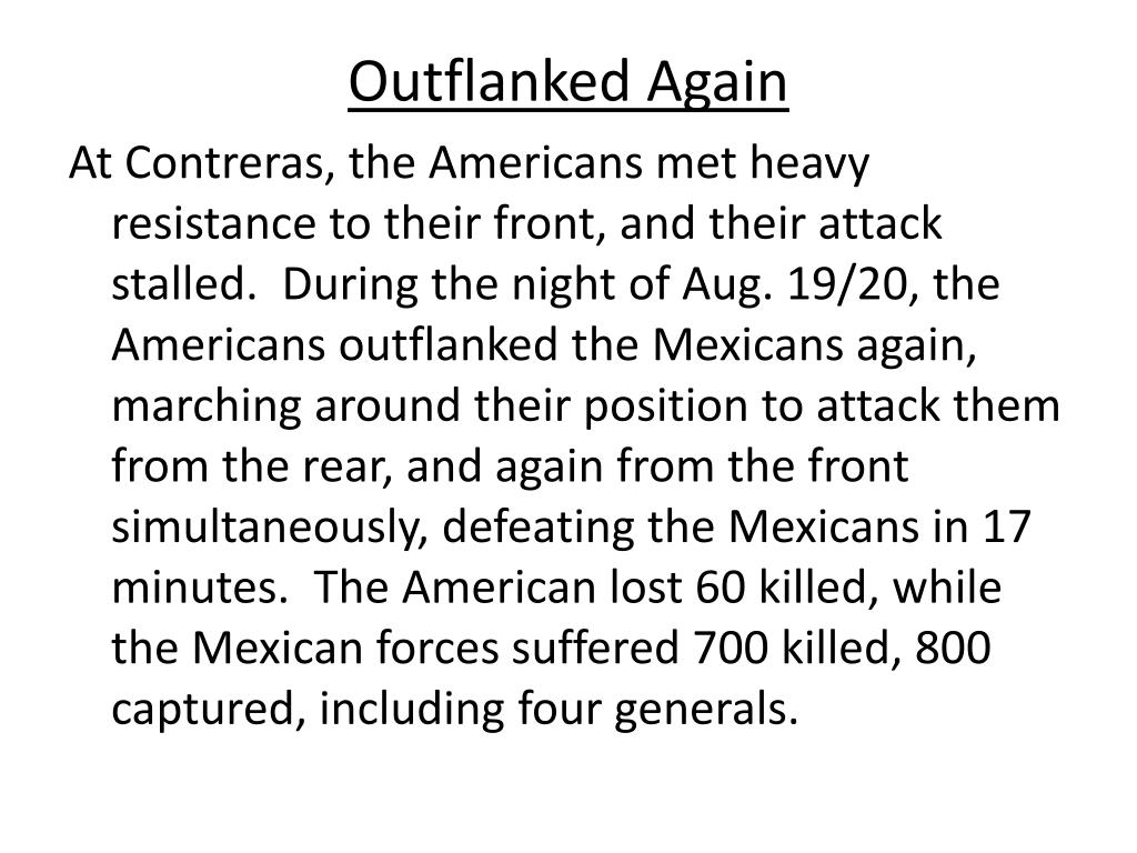 Outflanked Again At Contreras, the Americans met heavy resistance to their front, and their attack stalled. During the night of Aug. 19/20, the Americans outflanked the Mexicans again, marching around their position to attack them from the rear, and again from the front simultaneously, defeating the Mexicans in 17 minutes. The American lost 60 killed, while the Mexican forces suffered 700 killed, 800 captured, including four generals.