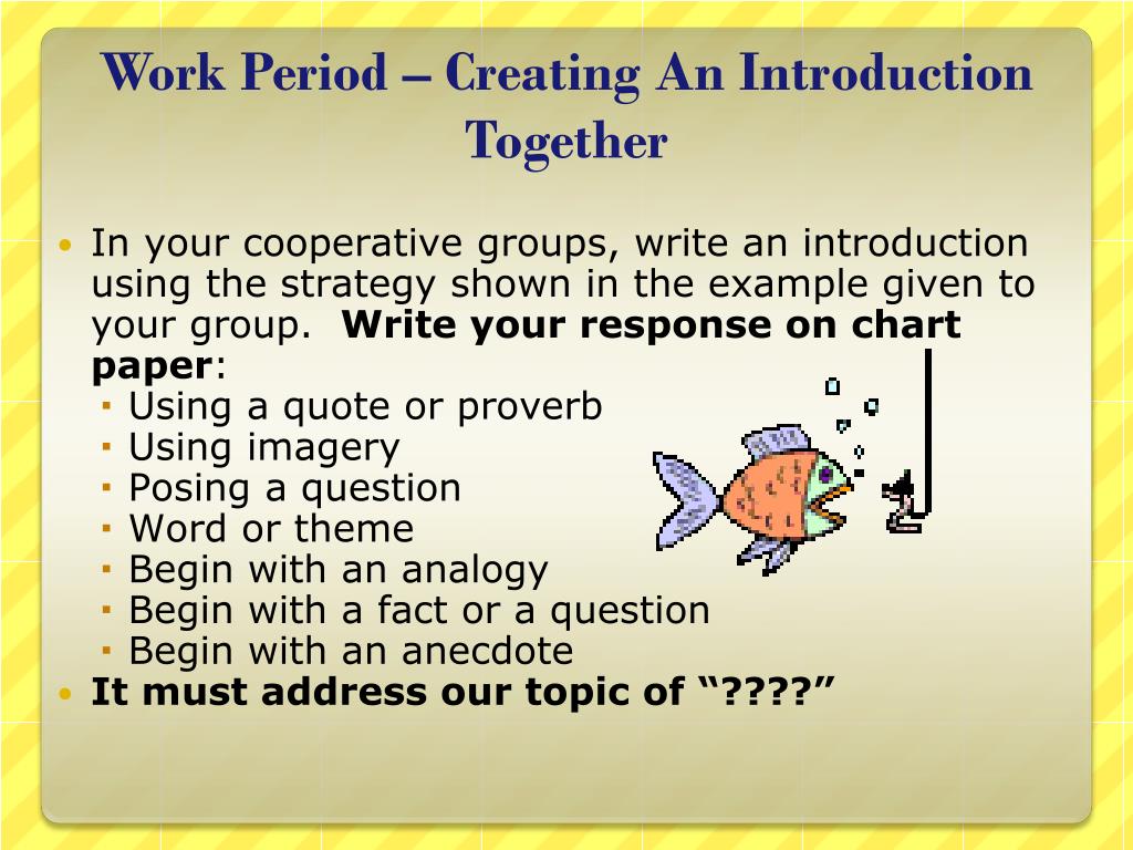 Work Period – Creating An Introduction Together • In your cooperative groups, write an introduction using the strategy shown in the example given to your group. Write your response on chart paper: • Using a quote or proverb • Using imagery • Posing a question • Word or theme • Begin with an analogy • Begin with a fact or a question • Begin with an anecdote • It must address our topic of “????”