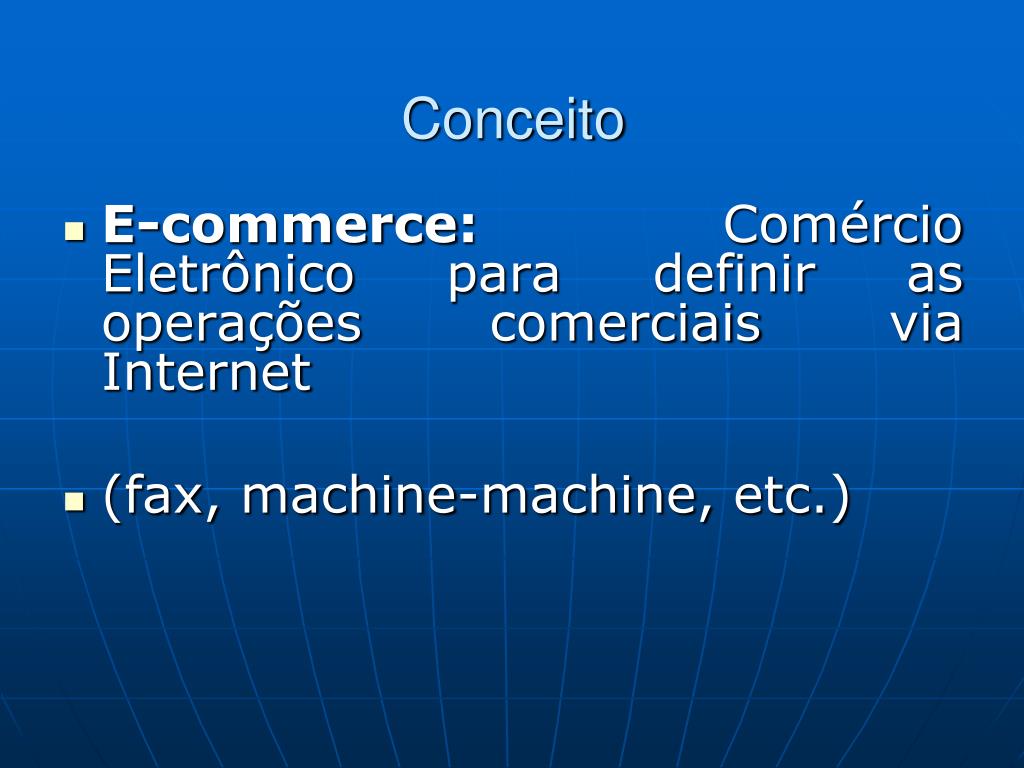 Conceito • E-commerce: Comércio Eletrônico para definir as operações comerciais via Internet • (fax, machine-machine, etc.)
