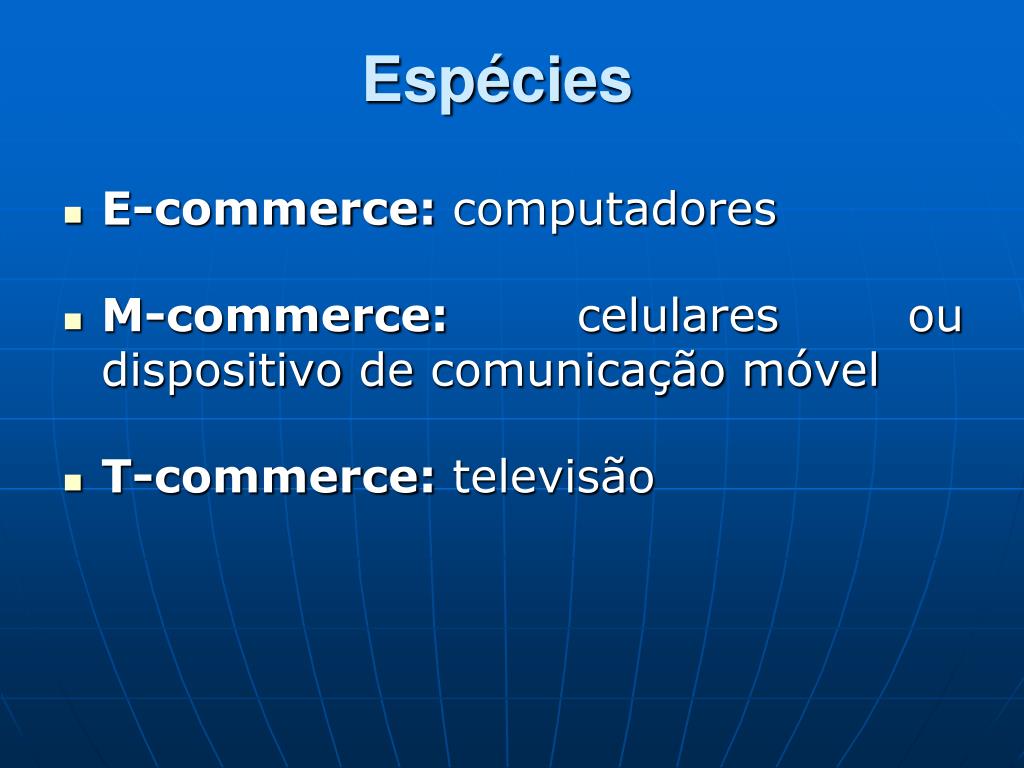 Espécies E-commerce: computadores M-commerce: celulares ou dispositivo de comunicação móvel T-commerce: televisão