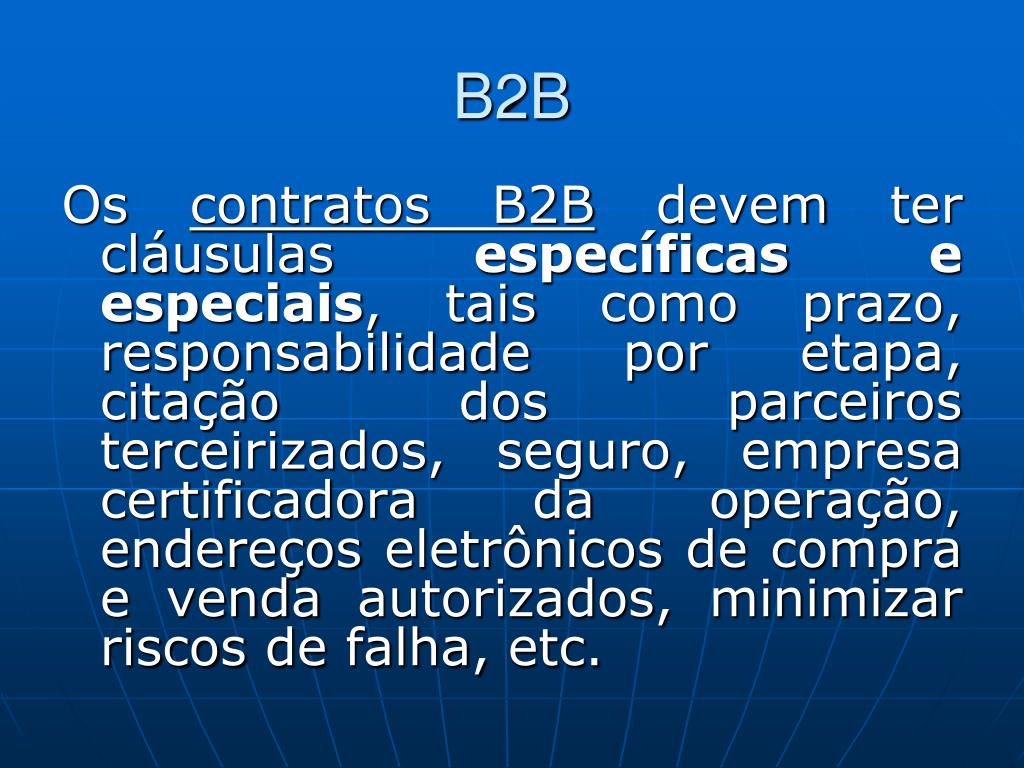 B2B Os contratos B2B devem ter cláusulas específicas e especiais, tais como prazo, responsabilidade por etapa, citação dos parceiros terceirizados, seguro, empresa certificadora da operação, endereços eletrônicos de compra e venda autorizados, minimizar riscos de falha, etc.
