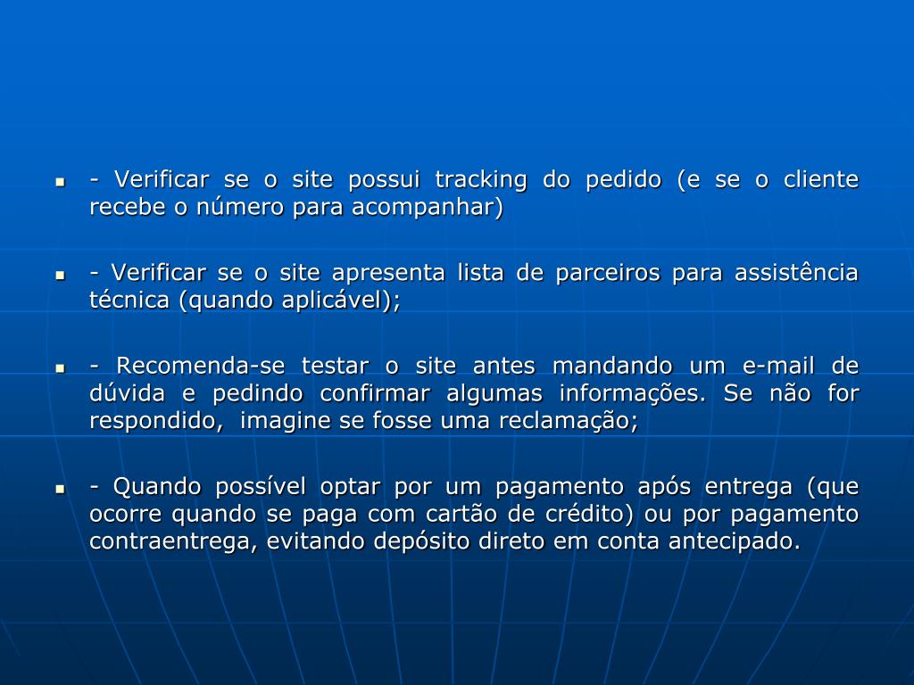- Verificar se o site possui tracking do pedido (e se o cliente recebe o número para acompanhar) - Verificar se o site apresenta lista de parceiros para assistência técnica (quando aplicável); - Recomenda-se testar o site antes mandando um e-mail de dúvida e pedindo confirmar algumas informações. Se não for respondido, imagine se fosse uma reclamação; - Quando possível optar por um pagamento após entrega (que ocorre quando se paga com cartão de crédito) ou por pagamento contraentrega, evitando depósito direto em conta antecipado.