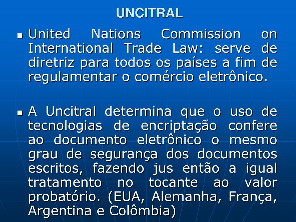 UNCITRAL • UnitedNationsCommissiononInternationalTrade Law: serve de diretriz para todos os países a fim de regulamentar o comércio eletrônico. • A Uncitral determina que o uso de tecnologias de encriptação confere ao documento eletrônico o mesmo grau de segurança dos documentos escritos, fazendo jus então a igual tratamento no tocante ao valor probatório. (EUA, Alemanha, França, Argentina e Colômbia)