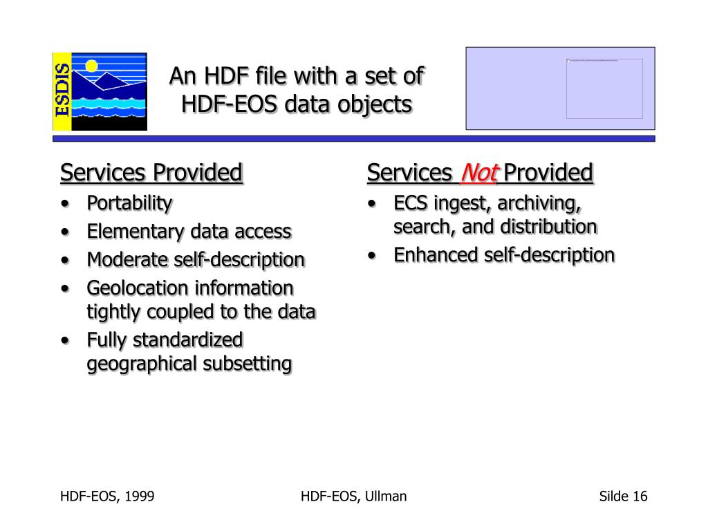 Services Provided Portability Elementary data access ECS ingest, archiving, search, and distribution Enhanced self-description Services Not Provided Geolocation information tightly coupled to the data Fully standardized geographical subsetting An HDF file with a set ofHDF data objects with EOSDIS metadata HDF-EOS, Ullman