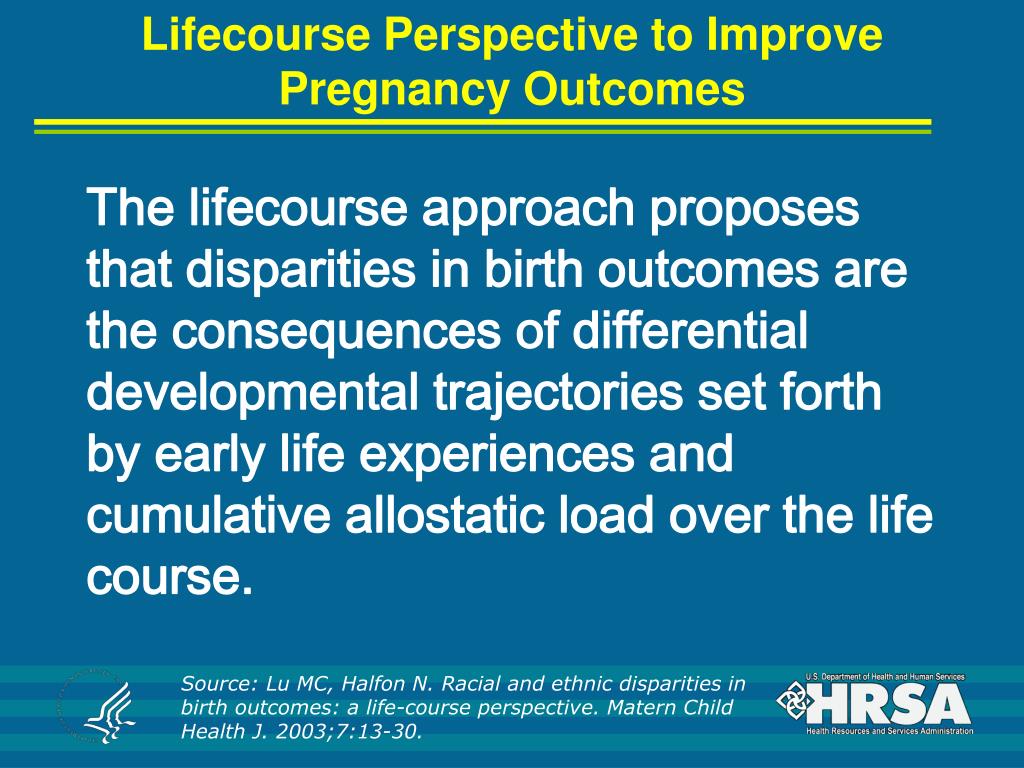Lifecourse Perspective to Improve Pregnancy Outcomes The lifecourse approach proposes that disparities in birth outcomes are the consequences of differential developmental trajectories set forth by early life experiences and cumulative allostatic load over the life course. Source: Lu MC, Halfon N. Racial and ethnic disparities in birth outcomes: a life-course perspective. Matern Child Health J. 2003;7:13-30.