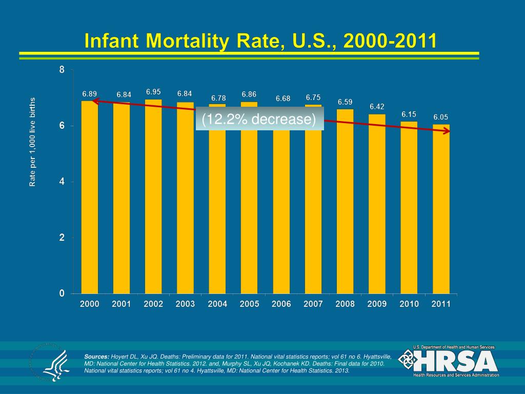 (12.2% decrease) Sources: Hoyert DL, Xu JQ. Deaths: Preliminary data for 2011. National vital statistics reports; vol 61 no 6. Hyattsville, MD: National Center for Health Statistics. 2012. and, Murphy SL, Xu JQ, Kochanek KD. Deaths: Final data for 2010. National vital statistics reports; vol 61 no 4. Hyattsville, MD: National Center for Health Statistics. 2013.