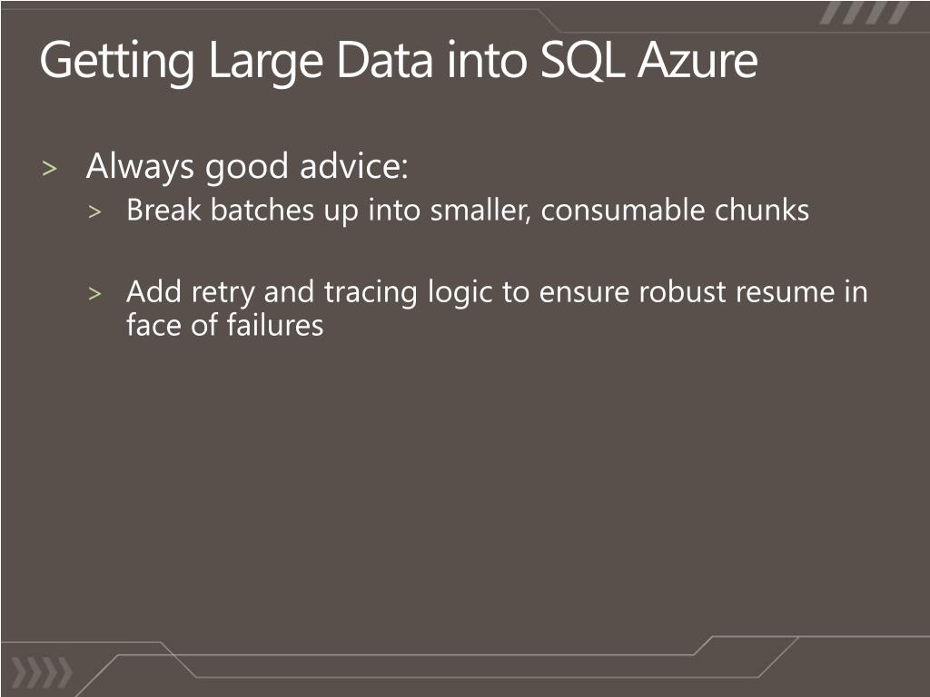 Getting Large Data into SQL Azure • Always good advice: • Break batches up into smaller, consumable chunks • Add retry and tracing logic to ensure robust resume in face of failures