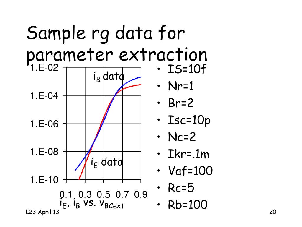 Sample fg data forparameter extraction • IS = 10f • NF = 1 • BF = 100 • Ise = 10E-14 • Ne = 2 • Ikf = .1m • Var = 200 • Re = 1 • Rb = 100 iC, iB vs. vBEext iC data iB data