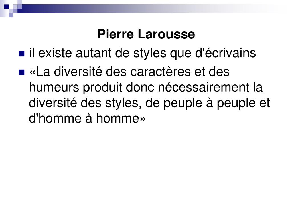 Pierre Larousse • il existe autant de styles que d'écrivains • «La diversité des caractères et des humeurs produit donc nécessairement la diversité des styles, de peuple à peuple et d'homme à homme»