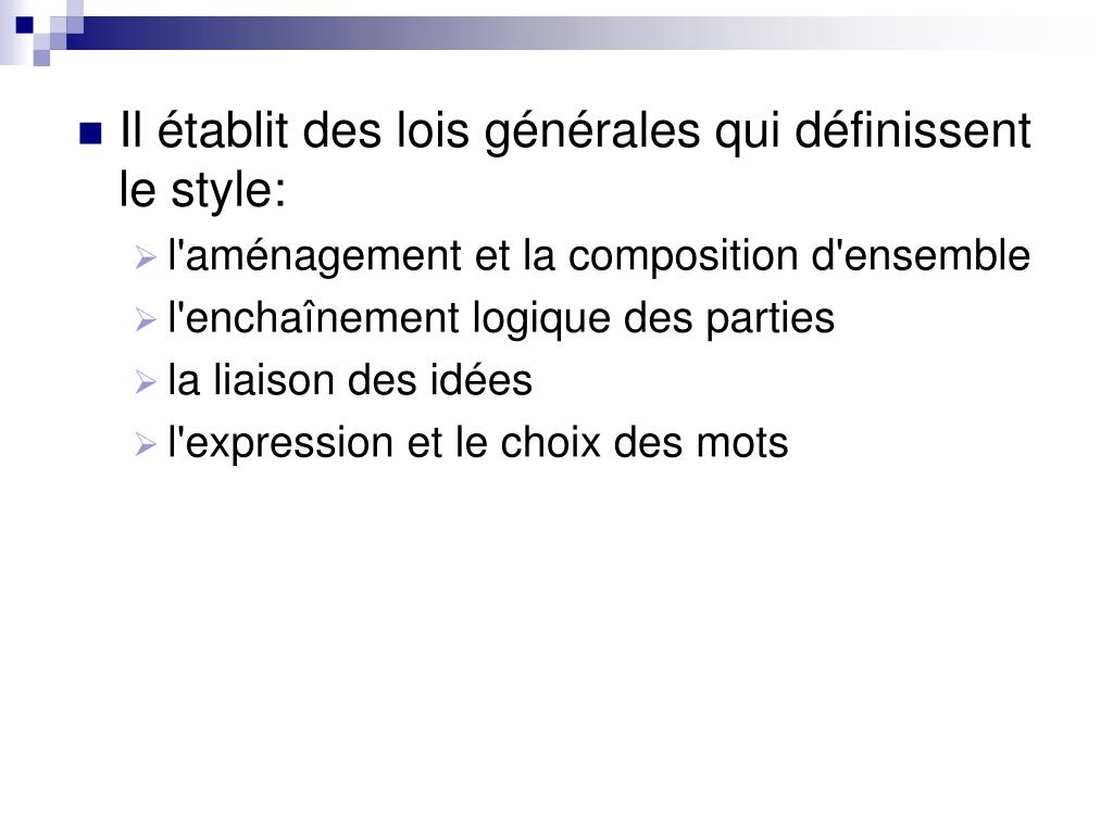 Il établit des lois générales qui définissent le style: • l'aménagement et la composition d'ensemble • l'enchaînement logique des parties • la liaison des idées • l'expression et le choix des mots