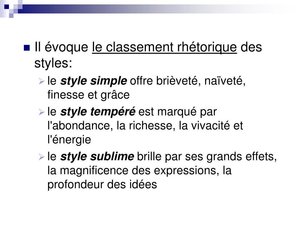 Il évoque le classement rhétorique des styles: • le style simple offre brièveté, naïveté, finesse et grâce • le style tempéré est marqué par l'abondance, la richesse, la vivacité et l'énergie • le style sublime brille par ses grands effets, la magnificence des expressions, la profondeur des idées