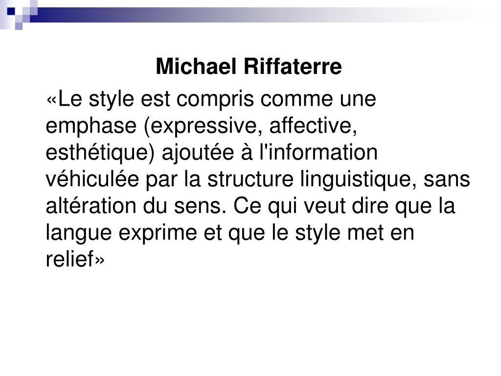 Michael Riffaterre «Le style est compris comme une emphase (expressive, affective, esthétique) ajoutée à l'information véhiculée par la structure linguistique, sans altération du sens. Ce qui veut dire que la langue exprime et que le style met en relief»