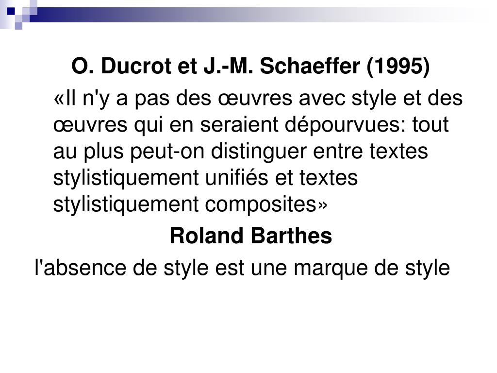 O. Ducrot et J.-M. Schaeffer (1995) «Il n'y a pas des œuvres avec style et des œuvres qui en seraient dépourvues: tout au plus peut-on distinguer entre textes stylistiquement unifiés et textes stylistiquement composites» Roland Barthes l'absence de style est une marque de style