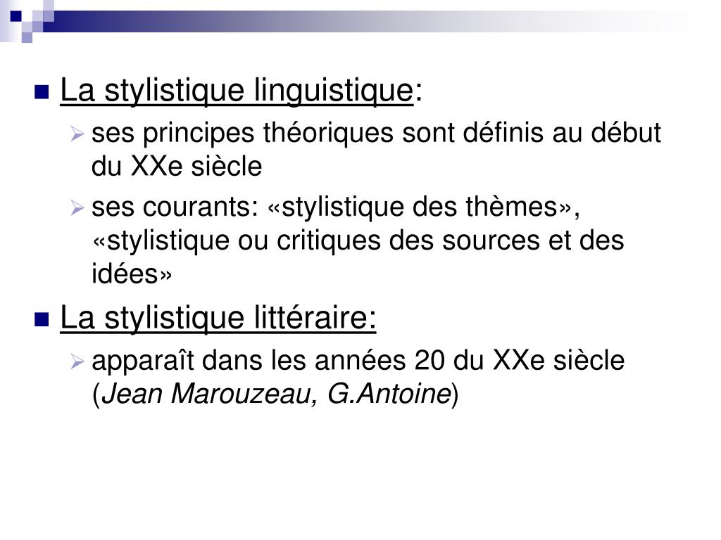 La stylistique linguistique: • ses principes théoriques sont définis au début du XXe siècle • ses courants: «stylistique des thèmes», «stylistique ou critiques des sources et des idées» • La stylistique littéraire: • apparaît dans les années 20 du XXe siècle(Jean Marouzeau, G.Antoine)