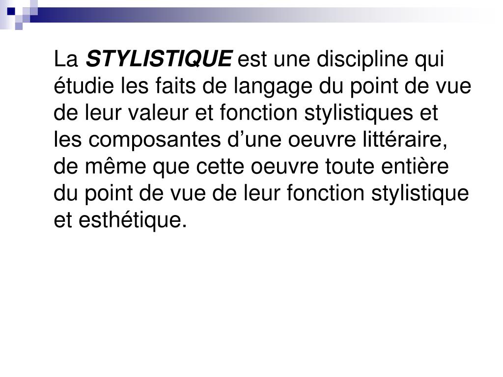 La STYLISTIQUE est une discipline qui étudie les faits de langage du point de vue de leur valeur et fonction stylistiques et les composantes d’une oeuvre littéraire, de même que cette oeuvre toute entière du point de vue de leur fonction stylistique et esthétique.