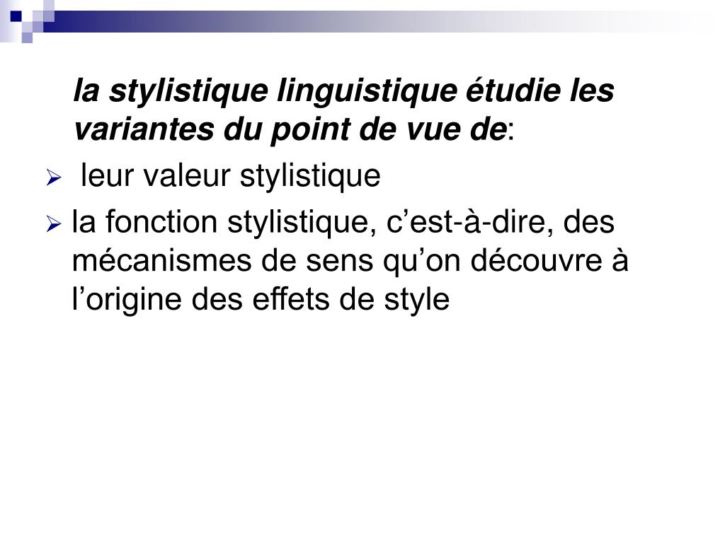 la stylistique linguistique étudie les variantes du point de vue de: • leur valeur stylistique • la fonction stylistique, c’est-à-dire, des mécanismes de sens qu’on découvre à l’origine des effets de style