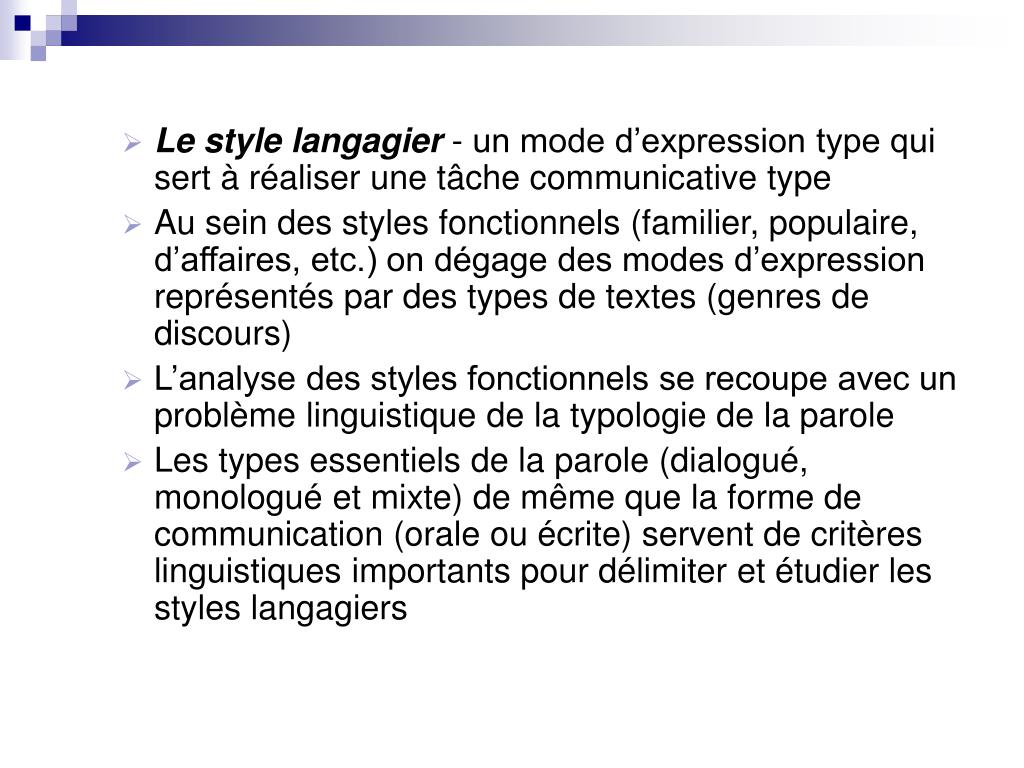 Le style langagier- un mode d’expression type qui sert à réaliser une tâche communicative type • Au sein des styles fonctionnels (familier, populaire, d’affaires, etc.) on dégage des modes d’expression représentés par des types de textes (genres de discours) • L’analyse des styles fonctionnels se recoupe avec un problème linguistique de la typologie de la parole • Les types essentiels de la parole (dialogué, monologué et mixte) de même que la forme de communication (orale ou écrite) servent de critères linguistiques importants pour délimiter et étudier les styles langagiers