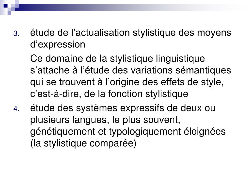 étude de l’actualisation stylistique des moyens d’expression Ce domaine de la stylistique linguistique s’attache à l’étude des variations sémantiques qui se trouvent à l’origine des effets de style, c’est-à-dire, de la fonction stylistique • étude des systèmes expressifs de deux ou plusieurs langues, le plus souvent, génétiquement et typologiquement éloignées (la stylistique comparée)