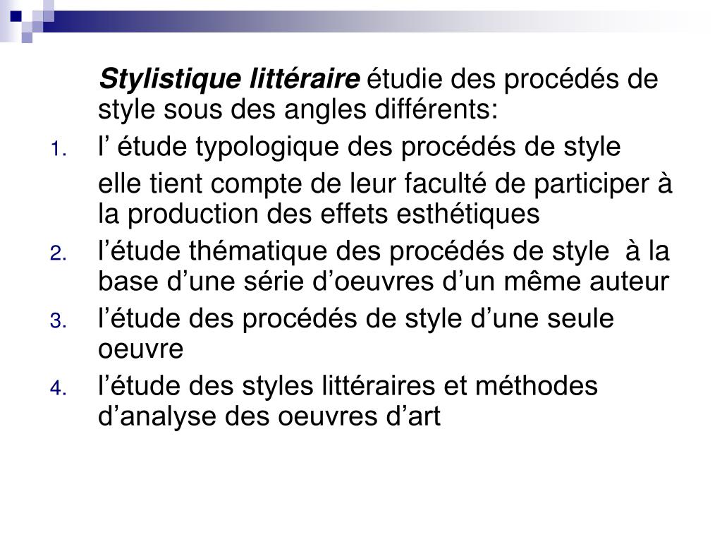 Stylistique littéraire étudie des procédés de style sous des angles différents: • l’ étude typologique des procédés de style elle tient comptede leur faculté de participer à la production des effets esthétiques • l’étude thématique des procédés de style àla base d’une série d’oeuvres d’un même auteur • l’étude des procédés de style d’une seule oeuvre • l’étude des styles littéraires et méthodes d’analyse des oeuvres d’art