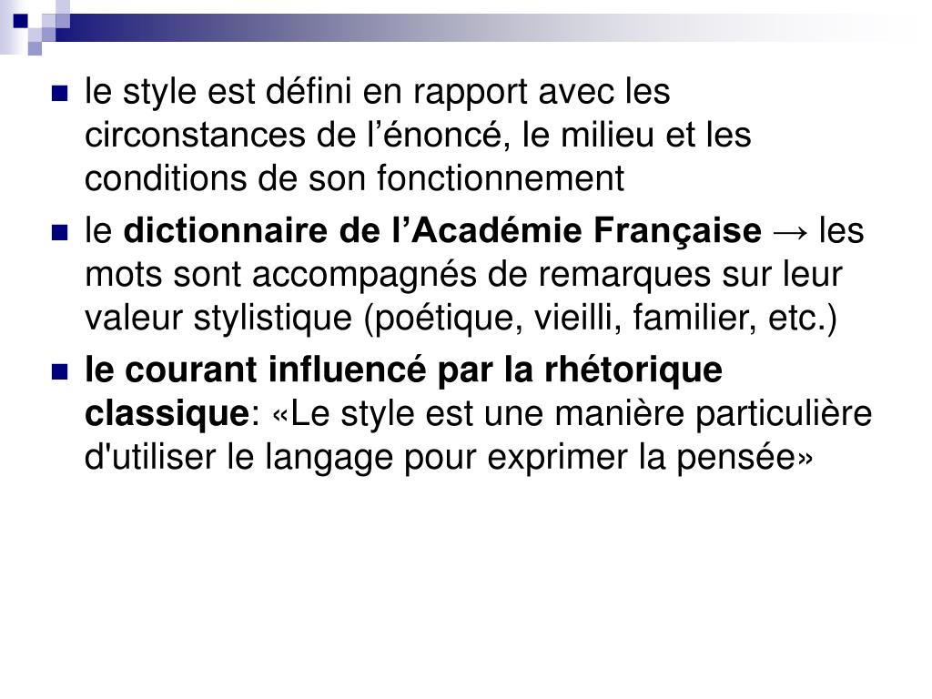 le style est défini en rapport avec les circonstances de l’énoncé, le milieu et les conditions de son fonctionnement • le dictionnaire de l’Académie Française→les mots sont accompagnés de remarques sur leur valeur stylistique (poétique, vieilli, familier, etc.) • le courant influencé par la rhétorique classique: «Le style est une manière particulière d'utiliser le langage pour exprimer la pensée»
