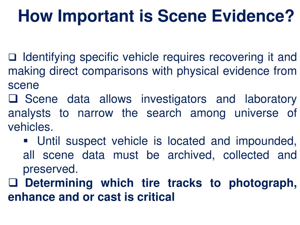 How Important is Scene Evidence? • Identifying specific vehicle requires recovering it and making direct comparisons with physical evidence from scene • Scene data allows investigators and laboratory analysts to narrow the search among universe of vehicles. • Until suspect vehicle is located and impounded, all scene data must be archived, collected and preserved. • Determining which tire tracks to photograph, enhance and or cast is critical