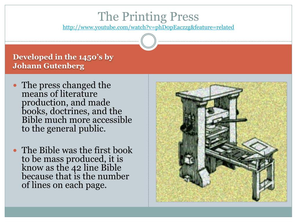 The Printing Presshttp://www.youtube.com/watch?v=phD0pEaczzg&feature=related Developed in the 1450’s by Johann Gutenberg The press changed the means of literature production, and made books, doctrines, and the Bible much more accessible to the general public. The Bible was the first book to be mass produced, it is know as the 42 line Bible because that is the number of lines on each page.
