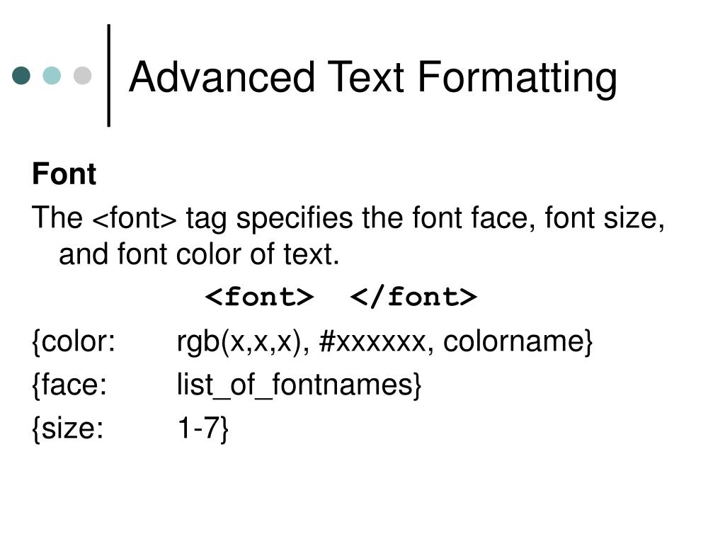 Advanced Text Formatting Font The <font> tag specifies the font face, font size, and font color of text. <font> </font> {color: rgb(x,x,x), #xxxxxx, colorname} {face: list_of_fontnames} {size: 1-7}