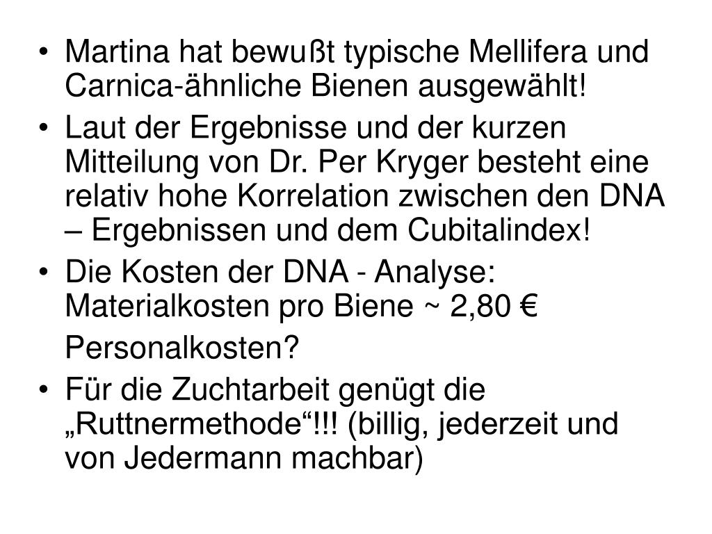 Martina hat bewußt typische Mellifera und Carnica-ähnliche Bienen ausgewählt! • Laut der Ergebnisse und der kurzen Mitteilung von Dr. Per Kryger besteht eine relativ hohe Korrelation zwischen den DNA – Ergebnissen und dem Cubitalindex! • Die Kosten der DNA - Analyse: Materialkosten pro Biene ~ 2,80 € Personalkosten? • Für die Zuchtarbeit genügt die „Ruttnermethode“!!! (billig, jederzeit und von Jedermann machbar)