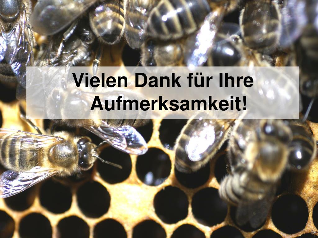 Fazit • Meine Arbeit soll durch die Erhebung und Kartierung der lokaltypischen Ausprägungen nach morphologischen, genetischen Merkmale und Verhaltenskriterien anhand ausgewählter Stichproben der Dunklen Biene in Österreich eine weitere wichtige Maßnahme zum Erhalt und Schutz dieser selten gewordenen Rasse darstellen. • Weiteres will ich die Züchter und Halter der Dunklen Biene in Österreich in ihrer wertvollen Zuchtarbeit und der Bewahrung wertvollen Genmaterials unterstützen und dazu beitragen eine weitere Nutztierart vor dem Aussterben zu bewahren.
