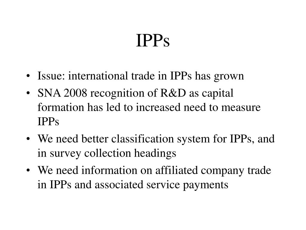 IPPs • Issue: international trade in IPPs has grown • SNA 2008 recognition of R&D as capital formation has led to increased need to measure IPPs • We need better classification system for IPPs, and in survey collection headings • We need information on affiliated company trade in IPPs and associated service payments