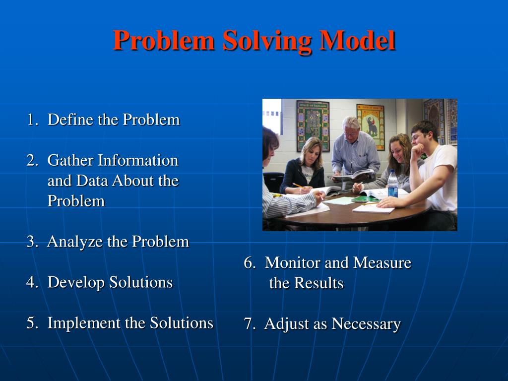 1. Define the Problem 2. Gather Information and Data About the Problem 3. Analyze the Problem 4. Develop Solutions 5. Implement the Solutions 6. Monitor and Measure the Results 7. Adjust as Necessary Problem Solving Model