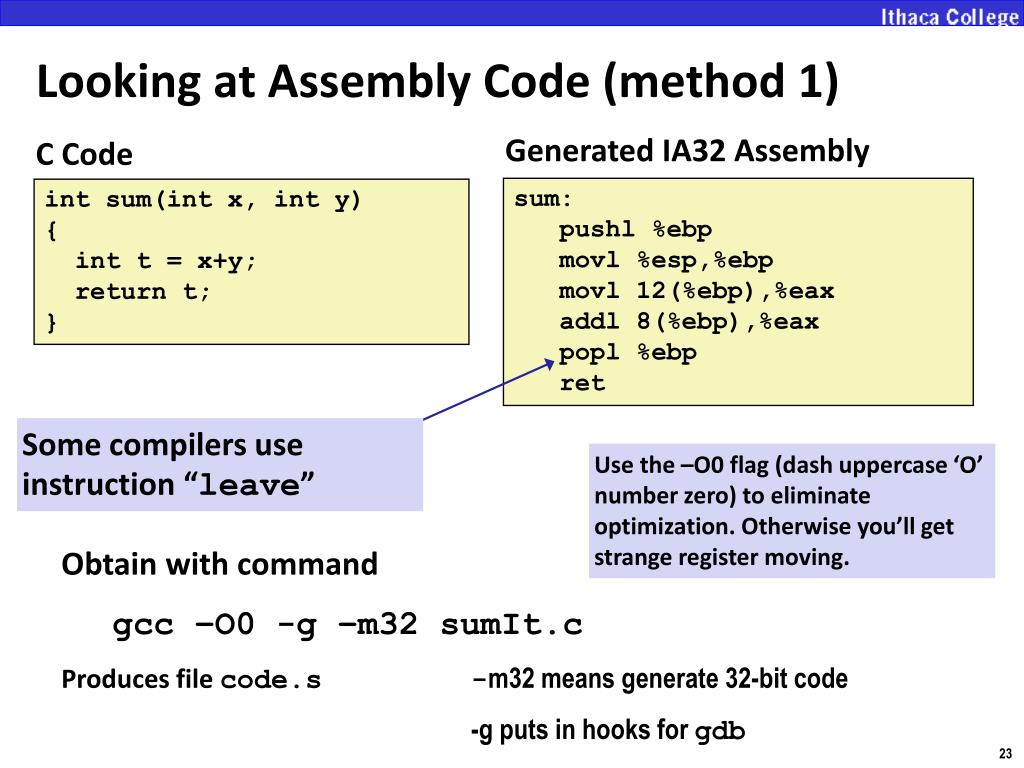 Looking at Assembly Code (method 1) Generated IA32 Assembly C Code sum: pushl%ebp movl%esp,%ebp movl12(%ebp),%eax addl8(%ebp),%eax popl%ebp ret intsum(intx, inty) { intt = x+y; return t; } Some compilers use instruction “leave” Use the –O0 flag (dash uppercase ‘O’ number zero) to eliminate optimization. Otherwise you’ll get strange register moving. • Obtain with command • gcc –O0 -g –m32 sumIt.c • Produces file code.s-m32 means generate 32-bit code • -g puts in hooks for gdb