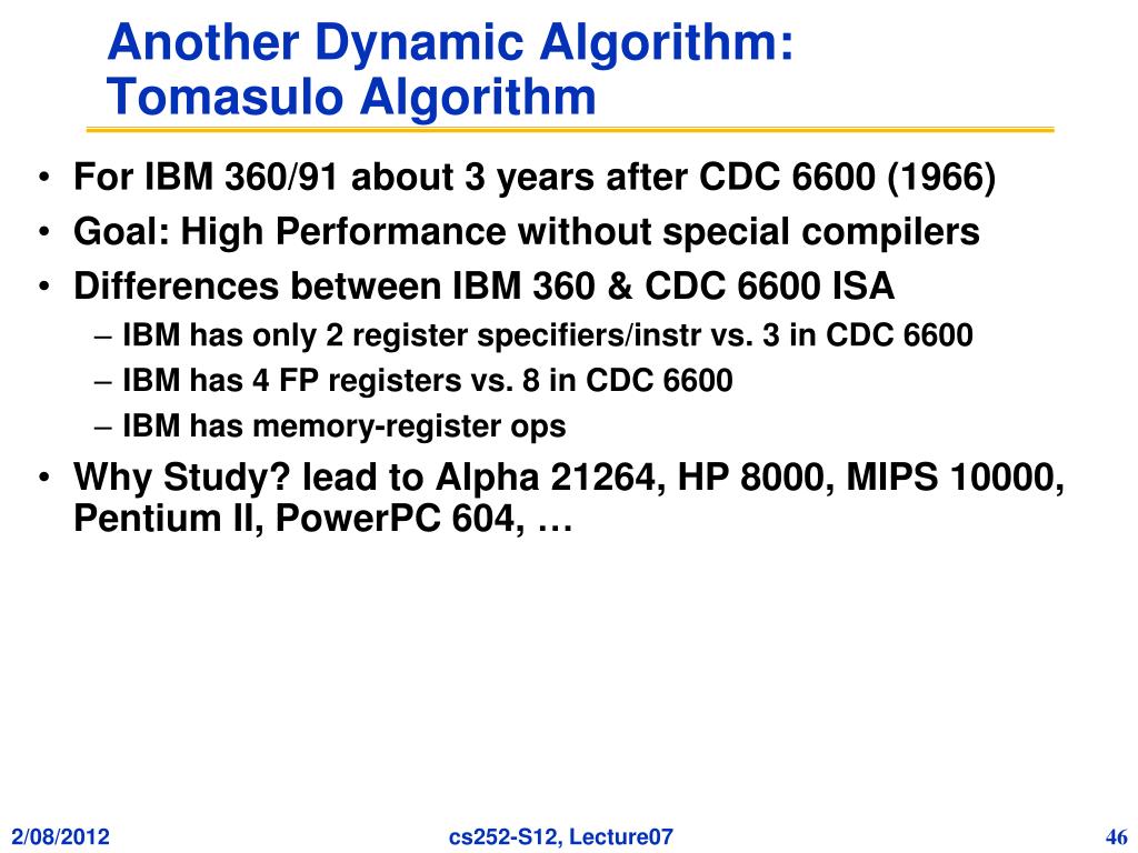 Another Dynamic Algorithm: Tomasulo Algorithm • For IBM 360/91 about 3 years after CDC 6600 (1966) • Goal: High Performance without special compilers • Differences between IBM 360 & CDC 6600 ISA • IBM has only 2 register specifiers/instr vs. 3 in CDC 6600 • IBM has 4 FP registers vs. 8 in CDC 6600 • IBM has memory-register ops • Why Study? lead to Alpha 21264, HP 8000, MIPS 10000, Pentium II, PowerPC 604, …