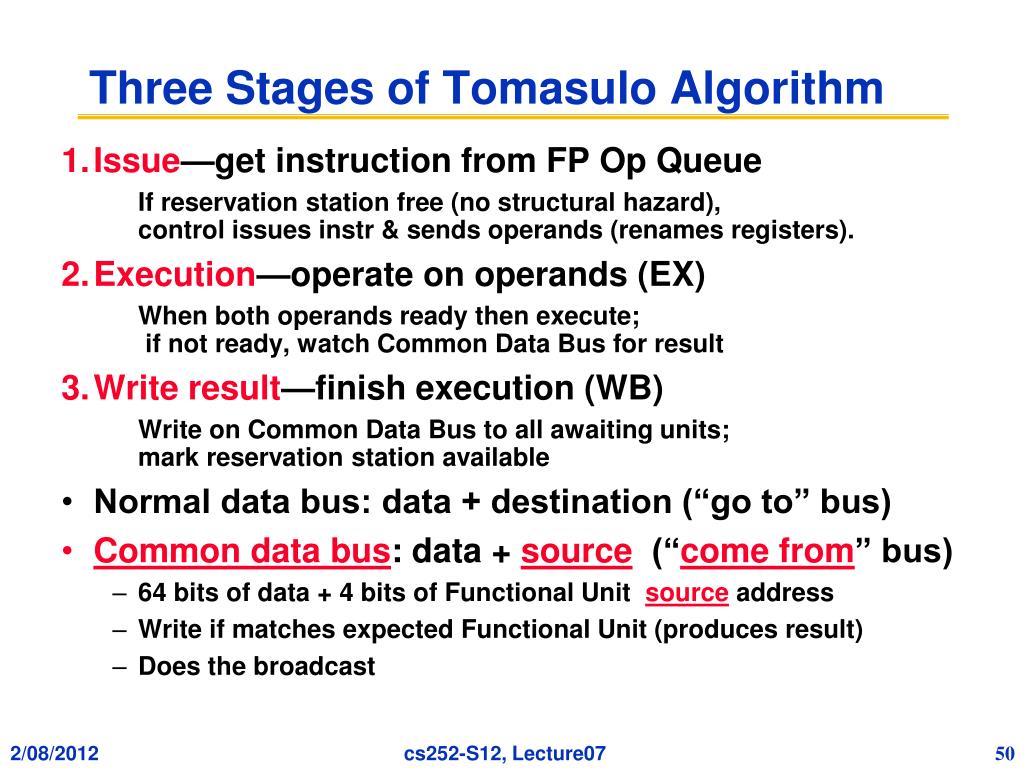 Three Stages of Tomasulo Algorithm 1. Issue—get instruction from FP Op Queue If reservation station free (no structural hazard), control issues instr & sends operands (renames registers). 2. Execution—operate on operands (EX) When both operands ready then execute; if not ready, watch Common Data Bus for result 3. Write result—finish execution (WB) Write on Common Data Bus to all awaiting units; mark reservation station available • Normal data bus: data + destination (“go to” bus) • Common data bus: data + source (“come from” bus) • 64 bits of data + 4 bits of Functional Unit source address • Write if matches expected Functional Unit (produces result) • Does the broadcast