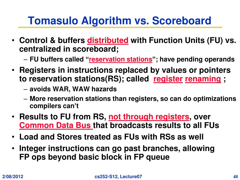 Tomasulo Algorithm vs. Scoreboard • Control & buffers distributed with Function Units (FU) vs. centralized in scoreboard; • FU buffers called “reservation stations”; have pending operands • Registers in instructions replaced by values or pointers to reservation stations(RS); called registerrenaming; • avoids WAR, WAW hazards • More reservation stations than registers, so can do optimizations compilers can’t • Results to FU from RS, not through registers, over Common Data Bus that broadcasts results to all FUs • Load and Stores treated as FUs with RSs as well • Integer instructions can go past branches, allowing FP ops beyond basic block in FP queue