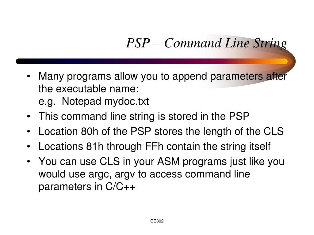 PSP – Command Line String • Many programs allow you to append parameters after the executable name:e.g. Notepad mydoc.txt • This command line string is stored in the PSP • Location 80h of the PSP stores the length of the CLS • Locations 81h through FFh contain the string itself • You can use CLS in your ASM programs just like you would use argc, argv to access command line parameters in C/C++ CE302