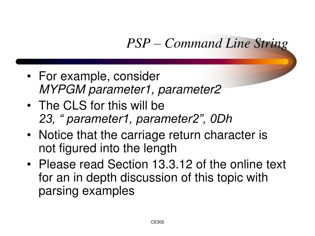 PSP – Command Line String • For example, considerMYPGM parameter1, parameter2 • The CLS for this will be 23, “ parameter1, parameter2”, 0Dh • Notice that the carriage return character is not figured into the length • Please read Section 13.3.12 of the online text for an in depth discussion of this topic with parsing examples CE302