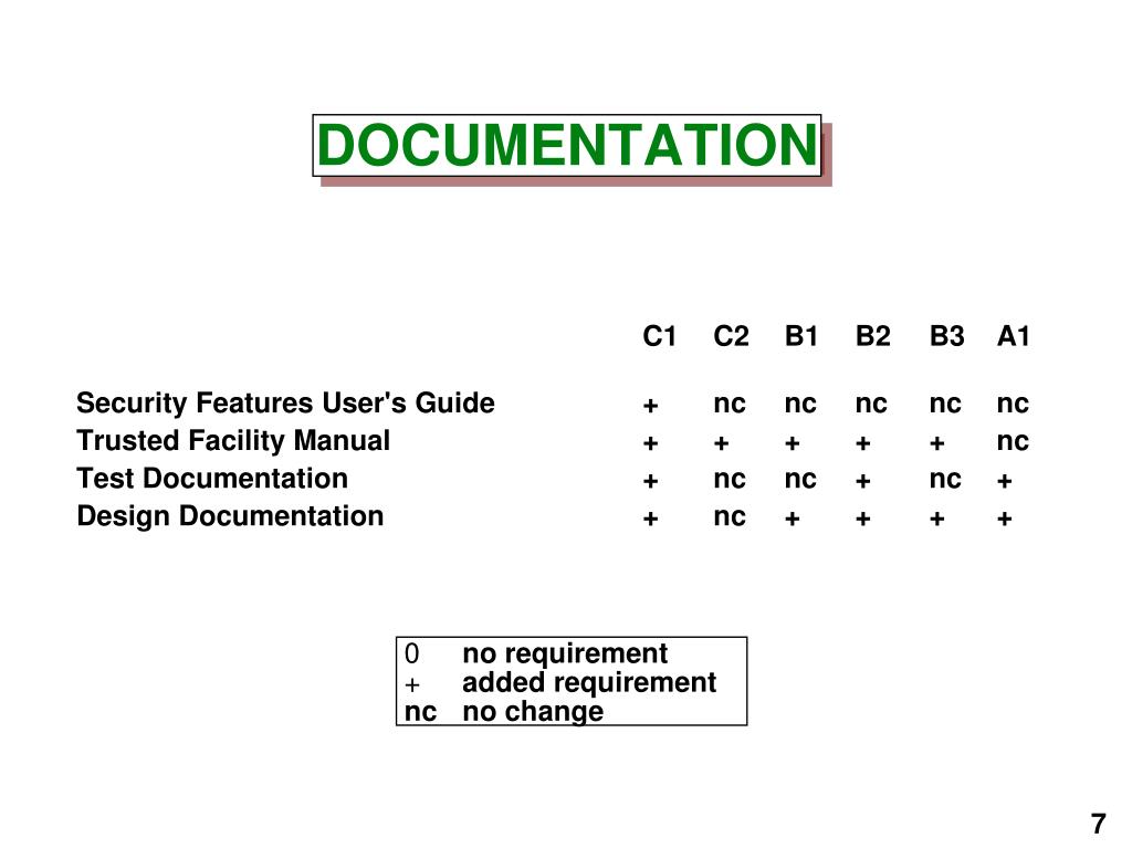 C1 C2 B1 B2 B3 A1 Security Features User's Guide + nc nc nc nc nc Trusted Facility Manual + + + + + nc Test Documentation + nc nc + nc + Design Documentation + nc + + + + DOCUMENTATION • no requirement • added requirement • nc no change