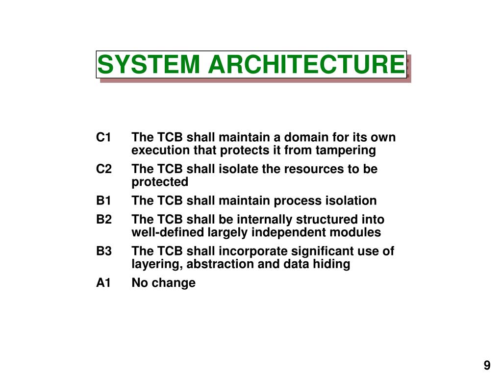 C1 The TCB shall maintain a domain for its own execution that protects it from tampering C2 The TCB shall isolate the resources to be protected B1 The TCB shall maintain process isolation B2 The TCB shall be internally structured into well-defined largely independent modules B3 The TCB shall incorporate significant use of layering, abstraction and data hiding A1 No change SYSTEM ARCHITECTURE