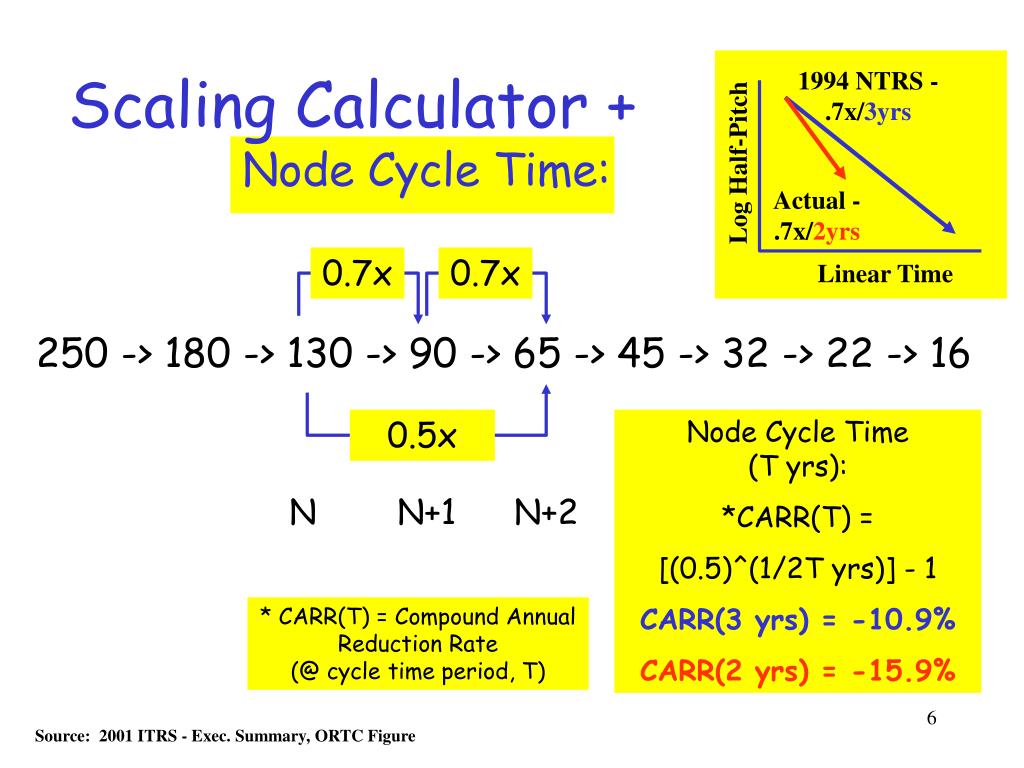1994 NTRS - .7x/3yrs Log Half-Pitch Actual - .7x/2yrs 0.7x 0.7x Linear Time 250 -> 180 -> 130 -> 90 -> 65 -> 45 -> 32 -> 22 -> 16 0.5x Node Cycle Time (T yrs): *CARR(T) = [(0.5)^(1/2T yrs)] - 1 CARR(3 yrs) = -10.9% CARR(2 yrs) = -15.9% N N+1 N+2 * CARR(T) = Compound Annual Reduction Rate (@ cycle time period, T) Scaling Calculator + Node Cycle Time: Source: 2001 ITRS - Exec. Summary, ORTC Figure