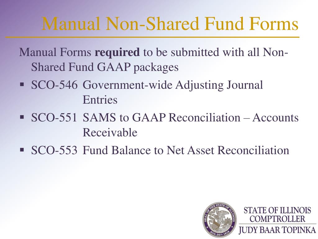 Manual Non-Shared Fund Forms Manual Forms required to be submitted with all Non-Shared Fund GAAP packages • SCO-546 Government-wide Adjusting Journal Entries • SCO-551 SAMS to GAAP Reconciliation – Accounts Receivable • SCO-553 Fund Balance to Net Asset Reconciliation