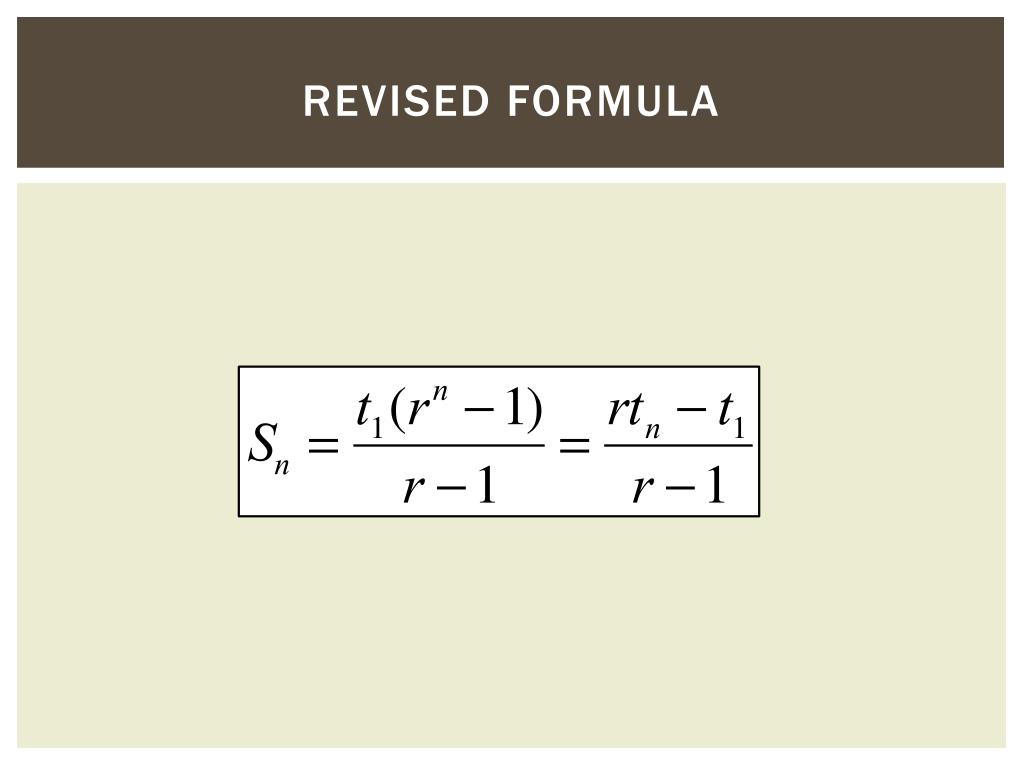 Alternate Formula method Determine the sum of each geometric series. 1/27 + 1/9 + 1/3 + … + 729 We can make an alternate formula that can make these kind of problems one step! The general formula can also be written like this. Using the general formula for a geometric sequence, we can multiply each side by r to find that t1rn can be equal to rtn Substitute: Our series: