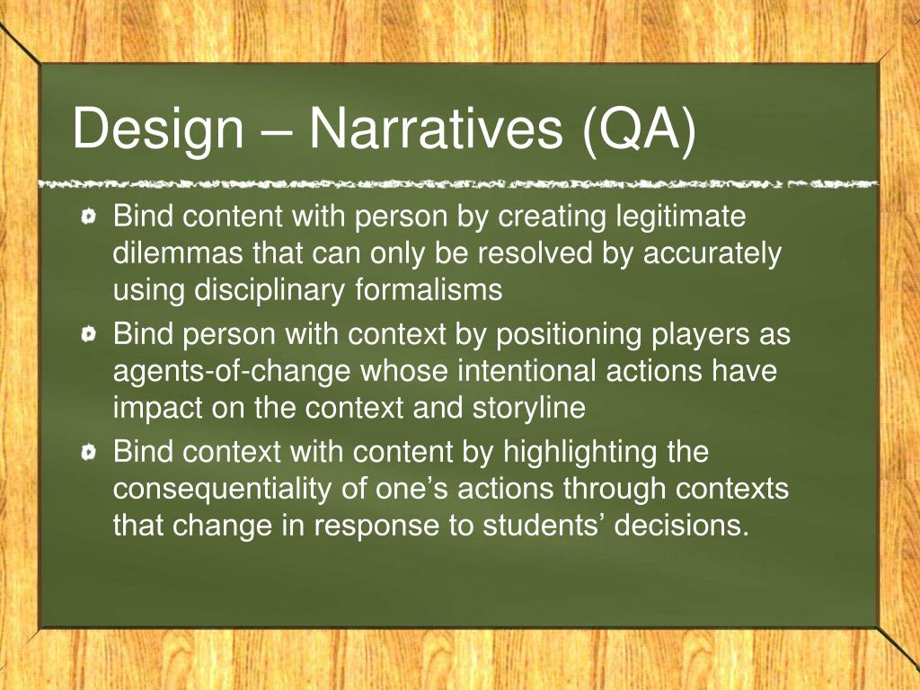 Design – Narratives (QA) • Bind content with person by creating legitimate dilemmas that can only be resolved by accurately using disciplinary formalisms • Bind person with context by positioning players as agents-of-change whose intentional actions have impact on the context and storyline • Bind context with content by highlighting the consequentiality of one’s actions through contexts that change in response to students’ decisions.