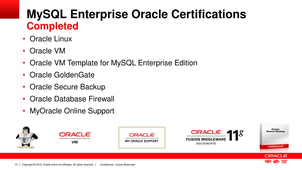 MySQL Enterprise Oracle CertificationsCompleted • Oracle Linux • Oracle VM • Oracle VM Template for MySQLEnterprise Edition • Oracle GoldenGate • Oracle Secure Backup • Oracle Database Firewall • MyOracle Online Support