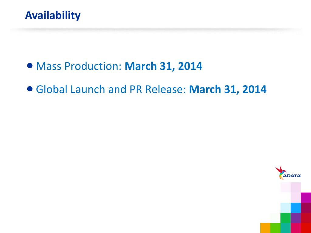 Availability • Mass Production: March 31, 2014 • Global Launch and PR Release: March 31, 2014