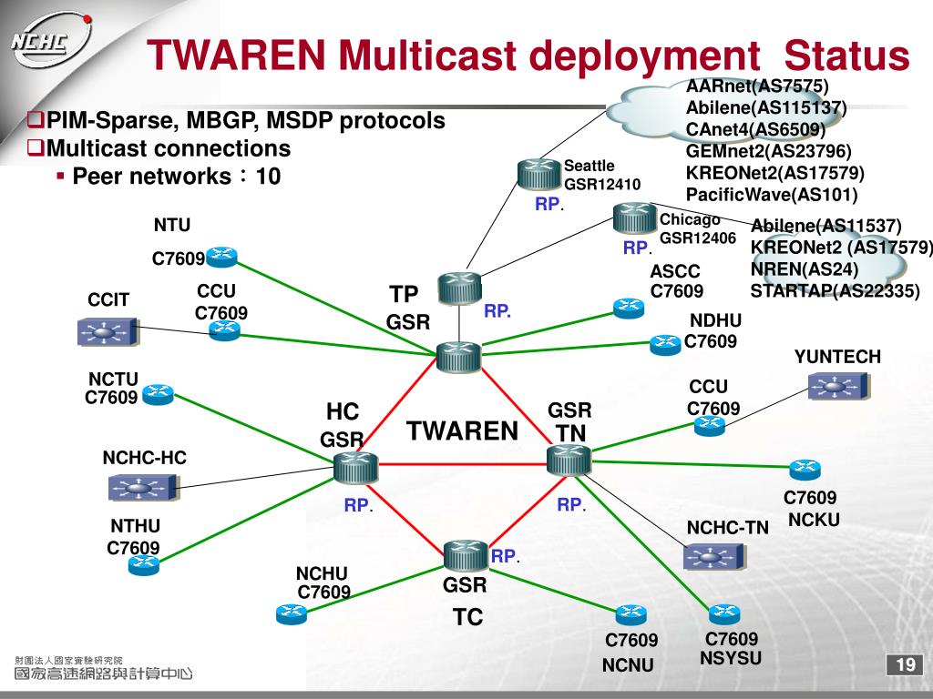 TWAREN Multicast deployment Status AARnet(AS7575) Abilene(AS115137) CAnet4(AS6509) GEMnet2(AS23796) KREONet2(AS17579) PacificWave(AS101) • PIM-Sparse, MBGP, MSDP protocols • Multicast connections • Peer networks:10 Seattle GSR12410 RP. Chicago GSR12406 Abilene(AS11537) KREONet2 (AS17579) NREN(AS24) STARTAP(AS22335) NTU RP. C7609 ASCC CCU TP C7609 CCIT RP. C7609 GSR NDHU C7609 YUNTECH NCTU CCU C7609 HC GSR C7609 TWAREN TN GSR NCHC-HC C7609 RP. RP. NCKU NTHU NCHC-TN C7609 RP. NCHU GSR C7609 TC C7609 C7609 NSYSU NCNU