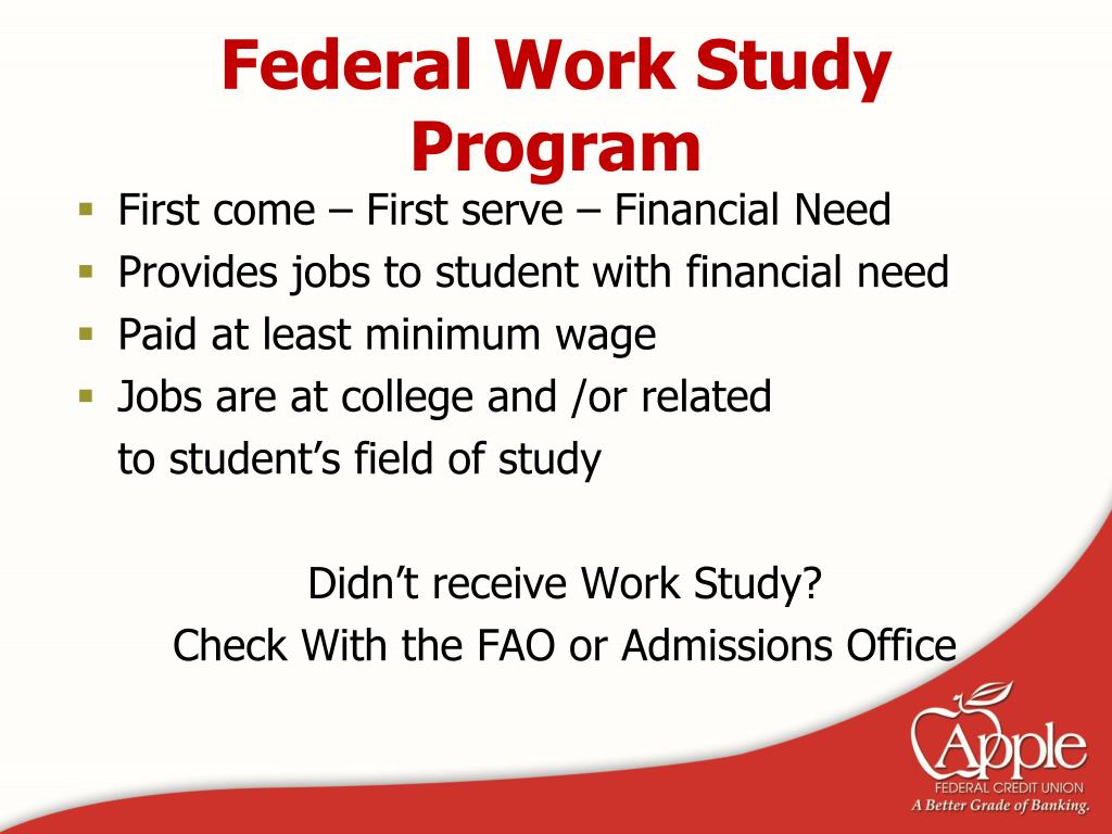 Federal Work Study Program • First come – First serve – Financial Need • Provides jobs to student with financial need • Paid at least minimum wage • Jobs are at college and /or related to student’s field of study Didn’t receive Work Study? Check With the FAO or Admissions Office