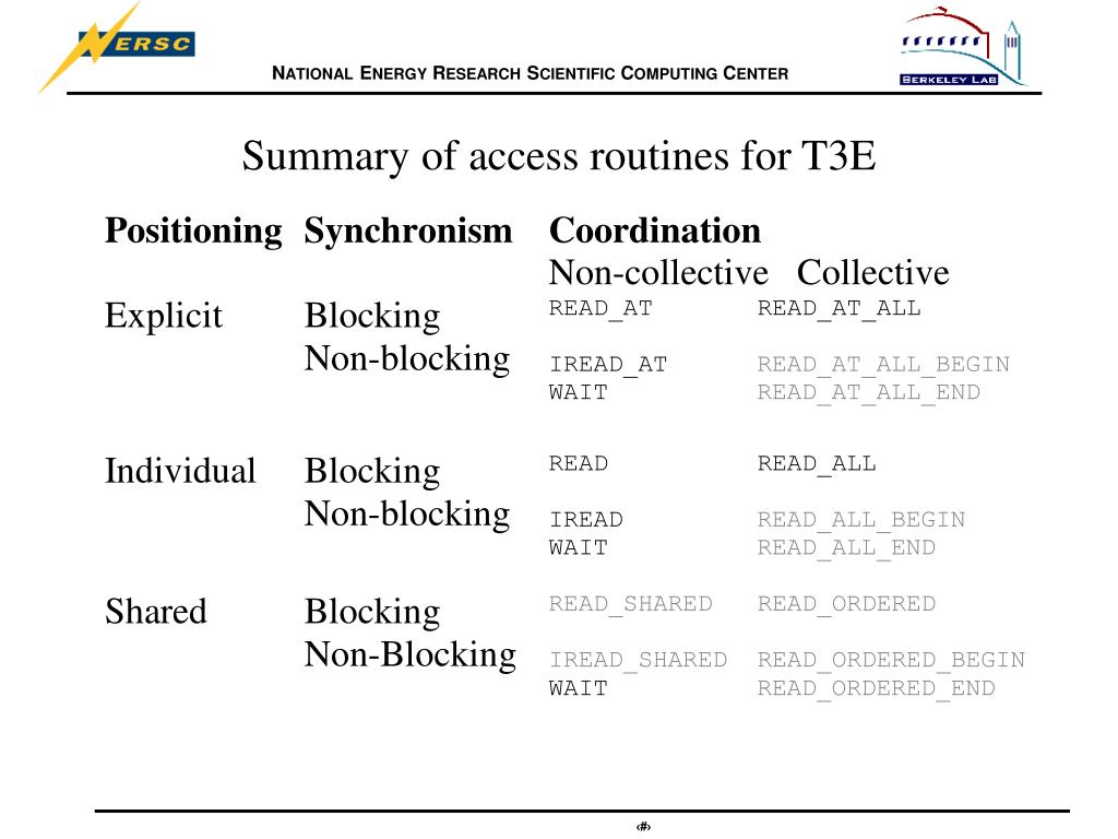 Positioning with a shared file • Positioning of a read or write is your responsibility • File pointers are private • Fortran • Use a direct access file, and read/write(rec=num) • Use Cray T3E extensions setpos and getpos to position file pointer (not portable) • C • Use ffseek • MPI I/O • MPI I/O fileview generally takes care of this. Positioning routines also available.