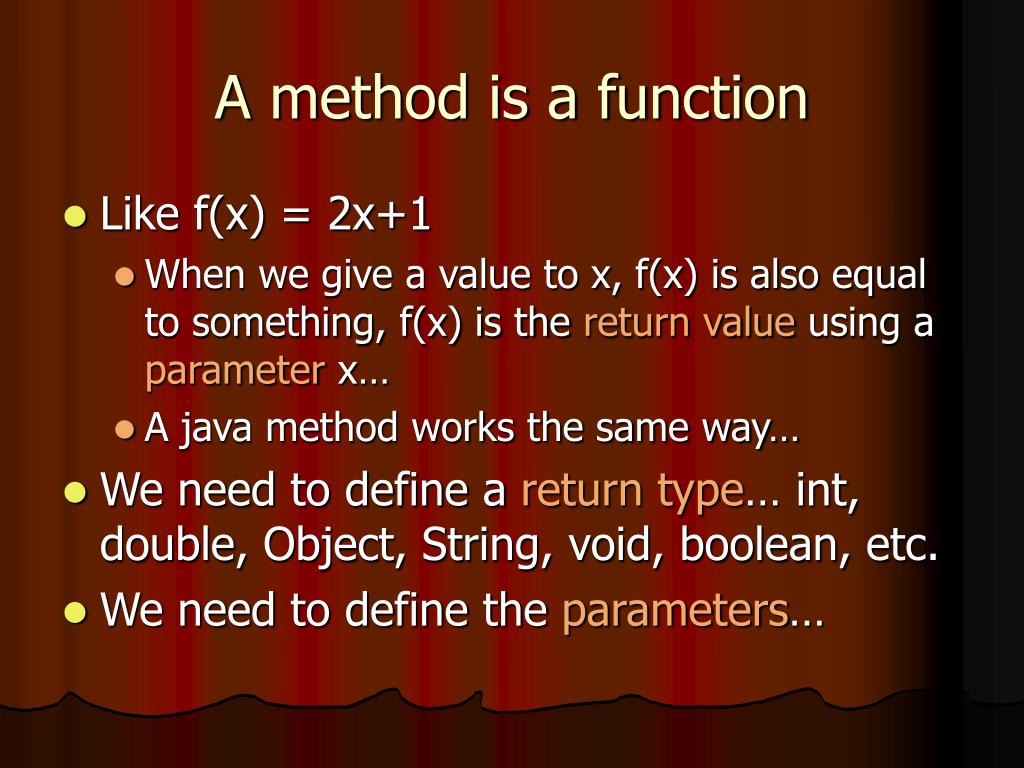 A method is a function • Like f(x) = 2x+1 • When we give a value to x, f(x) is also equal to something, f(x) is the return value using a parameter x… • A java method works the same way… • We need to define a return type… int, double, Object, String, void, boolean, etc. • We need to define the parameters…