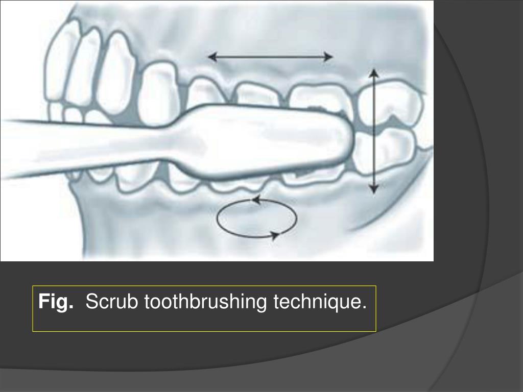 Themostnaturalbrushingmethods: • horizontalscrubtechnique; • rotarymotionsuchastheFonestechnique; • simpleup-and-downmotionoverthemaxillaryandmandibularteeth, ( theLeonardtechnique.)